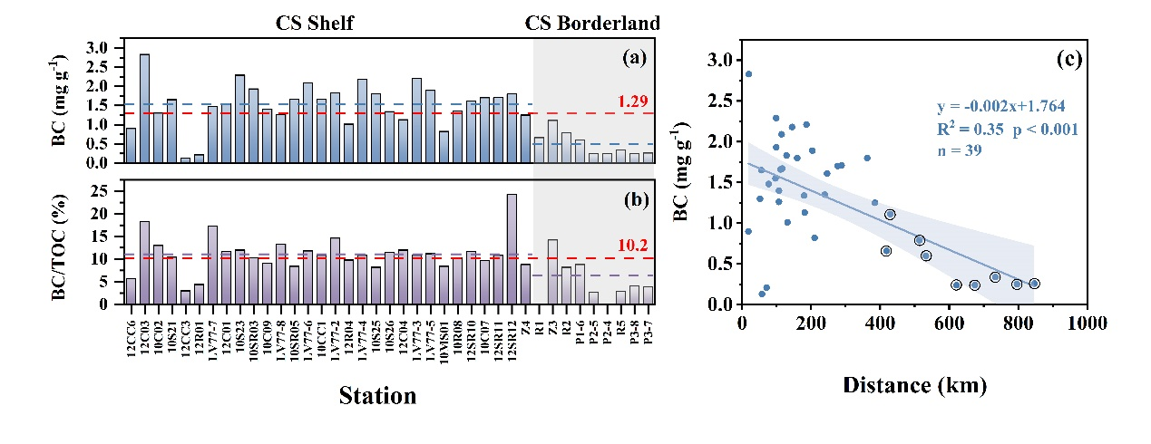 图1 楚科奇陆架和楚科奇边缘地表层沉积物中黑碳和黑碳/总有机碳的空间分布(a, b),以及黑碳含量与离岸距离的关系(c)