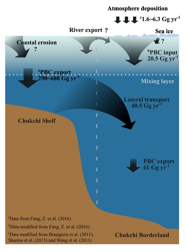 楚科奇边缘地的颗粒态黑碳通量呈现明显的季节性变化,海冰消融期的沉降通量是结冰期的四倍。其中,在结冰期间出现的高黑碳通量,可能反映了海底底流增强对楚科奇陆架沉积碳源的刮蚀作用,并北向搬运至楚科奇边缘地。基于沉积物捕获器记录的黑碳通量,估算每年有约40.5 Gg的颗粒态黑碳 (大约466 Gg颗粒有机碳)从楚科奇陆架向北侧向输运至楚科奇边缘地一带(图2)。